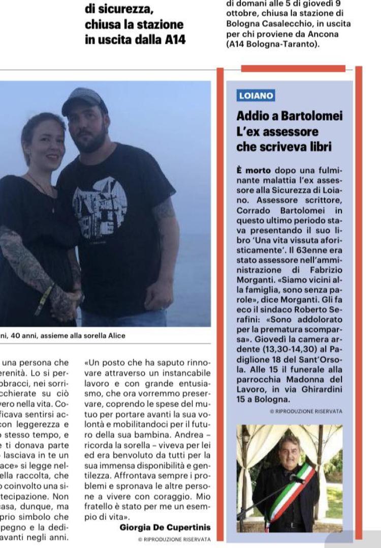 Un articolo del Carlino di oggi ricorda Corrado Bartolomei, l'ex Assessore di Loiano, recentemente scomparso.I funerali si svolgeranno giovedì 9 ottobre a Bologna