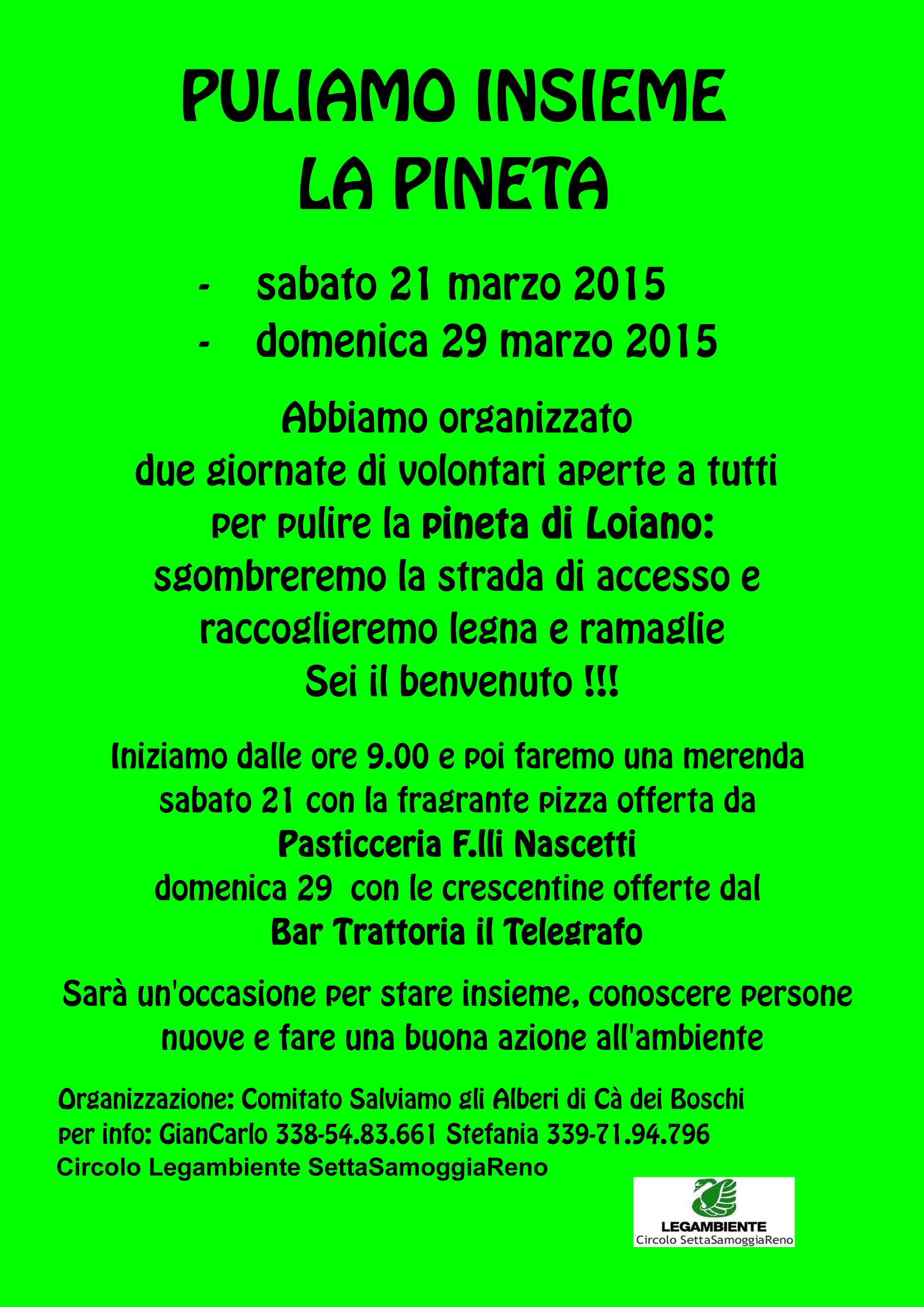 Nelle giornate di Sabato 21 e domenica 29 marzo dalle ore 9,00 si svolgerà una lodevole iniziativa in favore della Pineta fortemente danneggiata dopo la nevicata di febbraio.