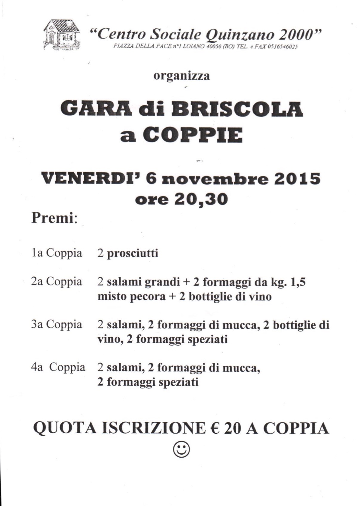 Il Centro Sociale Quinzano 2000 organizza per venerdì 6 novembre una Gara di briscola a coppie. Ricchi premi fino alla quarta coppia classificata. Quota iscrizione € 20,00 a coppia.
