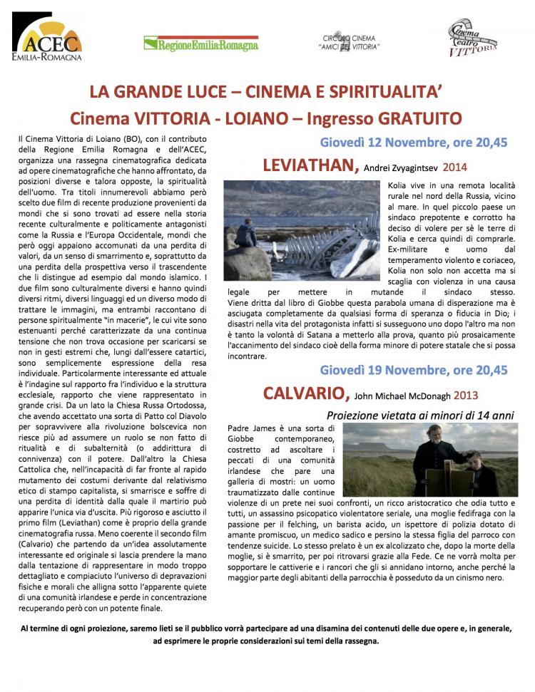 Il Cinema Vittoria di Loiano (BO), con il contributo della Regione Emilia Romagna e dell’ACEC, organizza una rassegna cinematografica dedicata ad opere cinematografiche che hanno affrontato, da posizioni diverse e talora opposte, la spiritualità dell’uomo. Tra titoli innumerevoli abbiamo però scelto due film di recente produzione provenienti da mondi che si sono trovati ad essere nella storia recente culturalmente e politicamente antagonisti come la Russia e l’Europa Occidentale, mondi che però oggi appaiono accomunati da una perdita di valori, da un senso di smarrimento e, soprattutto da una perdita della prospettiva verso il trascendente che li distingue ad esempio dal mondo islamico. I due film sono culturalmente diversi e hanno quindi diversi ritmi, diversi linguaggi ed un diverso modo di trattare le immagini, ma entrambi raccontano di persone spiritualmente “in macerie”, le cui vite sono estenuanti perché caratterizzate da una continua tensione che non trova occasione per scaricarsi se non in gesti estremi che, lungi dall’essere catartici, sono semplicemente espressione della resa individuale. Particolarmente interessante ed attuale è l’indagine sul rapporto fra l’individuo e la struttura ecclesiale, rapporto che viene rappresentato in grande crisi. Da un lato la Chiesa Russa Ortodossa, che avendo accettato una sorta di Patto col Diavolo per sopravvivere alla rivoluzione bolscevica non riesce più ad assumere un ruolo se non fatto di ritualità e di subalternità (o addirittura di connivenza) con il potere. Dall’altro la Chiesa Cattolica che, nell’incapacità di far fronte al rapido mutamento dei costumi derivante dal relativismo etico di stampo capitalista, si smarrisce e soffre di una perdita di identità dalla quale il martirio può apparire l’unica via d’uscita. Più rigoroso e asciutto il primo film (Leviathan) come è proprio della grande cinematografia russa. Meno coerente il secondo film (Calvario) che partendo da un’idea assolutamente interessante ed originale si lascia prendere la mano dalla tentazione di rappresentare in modo troppo dettagliato e compiaciuto l’universo di depravazioni fisiche e morali che alligna sotto l’apparente quiete di una comunità irlandese e perde in concentrazione recuperando però con un potente finale.