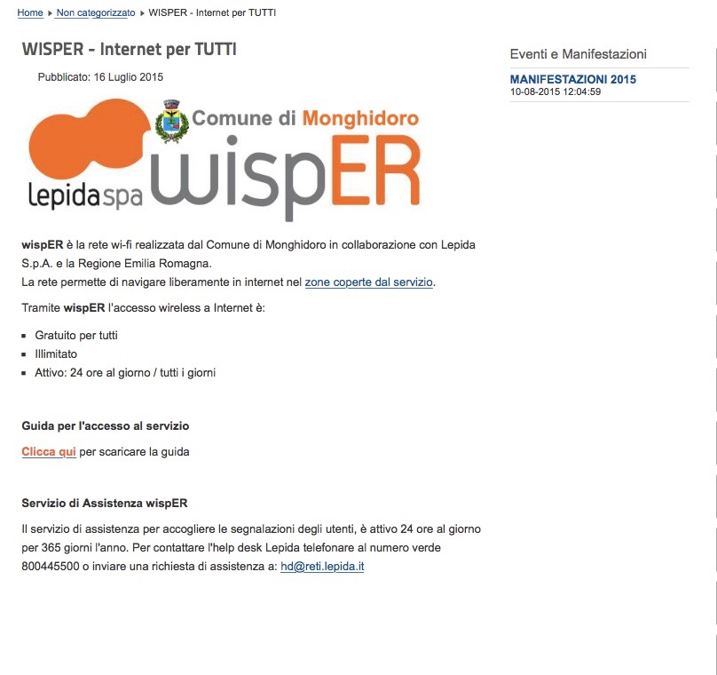 Come riportato nella home page web del Comune di Monghidoro, dal luglio 2015 in ampie zone del centro è possibile connettersi gratuitamente alla rete wireless senza limiti di tempo. Questo grazie all'accordo stipulato con Lepida spa e la Regione Emilia Romagna che mette a disposizione anche un servizio assistenza per 365 giorni all'anno. Un'immagine aerea riporta le zone coperte dal servizio ma non si conosce la potenza o l'efficienza del segnale.