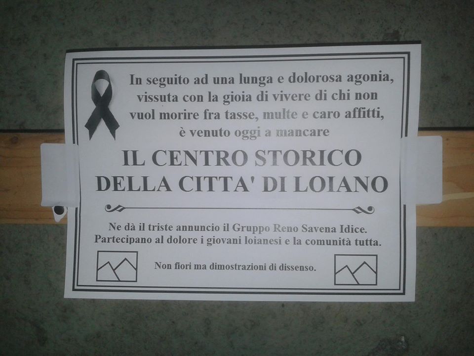 "In seguito ad una lunga e dolorosa agonia, vissuta con la gioia di vivere di chi non vuole morire fra tasse, multe e caro affitti, è venuto oggi a mancare IL CENTRO STORICO DELLA CITTA' DI LOIANO. Ne dà il triste annuncio il Gruppo Reno Savena Idice. Partecipano al dolore i giovani loianesi e la comunità tutta. Non fiori ma dimostrazioni di dissenso."