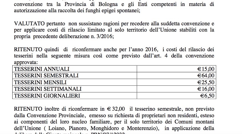 Con la Delibera n. 15 del 2 marzo 2016, l'Unione dei Comuni Savena - Idice determina il costo dei tesserini per i funghi nel 2016 (allegata).
