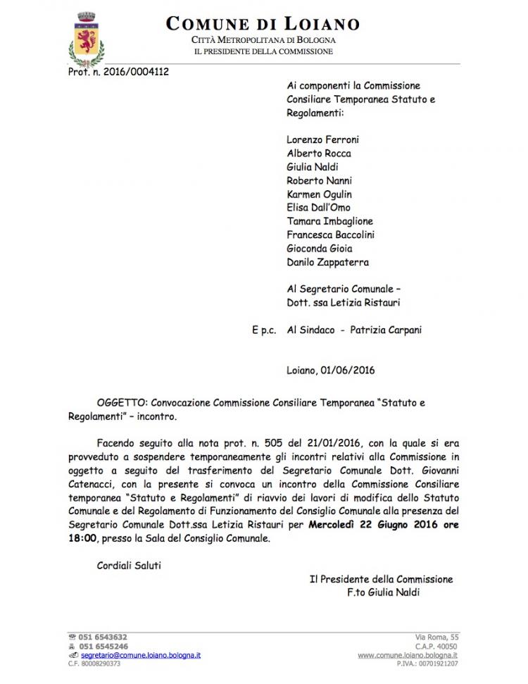 Mercoledì 22 giugno dalle ore 18,00 in sala del Consiglio a Loiano, si terrà la Commissione Consiliare temporanea “Statuto e Regolamenti”. Lavori di modifica dello Statuto Comunale e del Regolamento di Funzionamento del Consiglio Comunale.