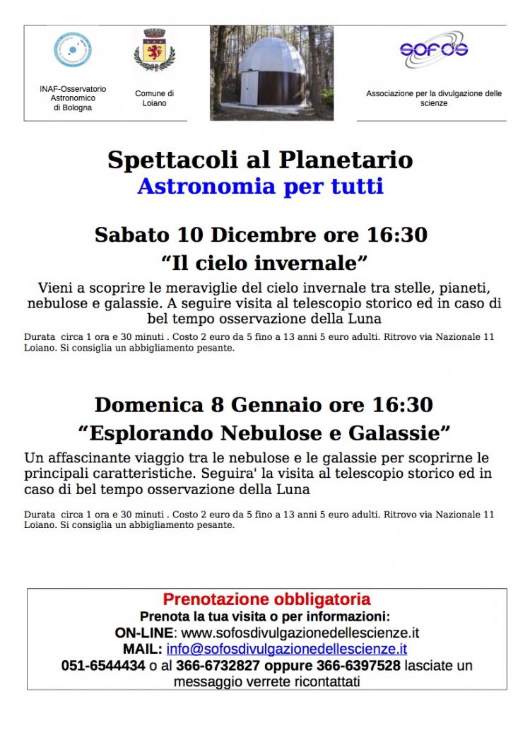 Sabato 10 Dicembre e domenica 8 Gennaio due appuntamenti con "Gli spettacoli al Planetario di Loiano - Astronomia per tutti".
