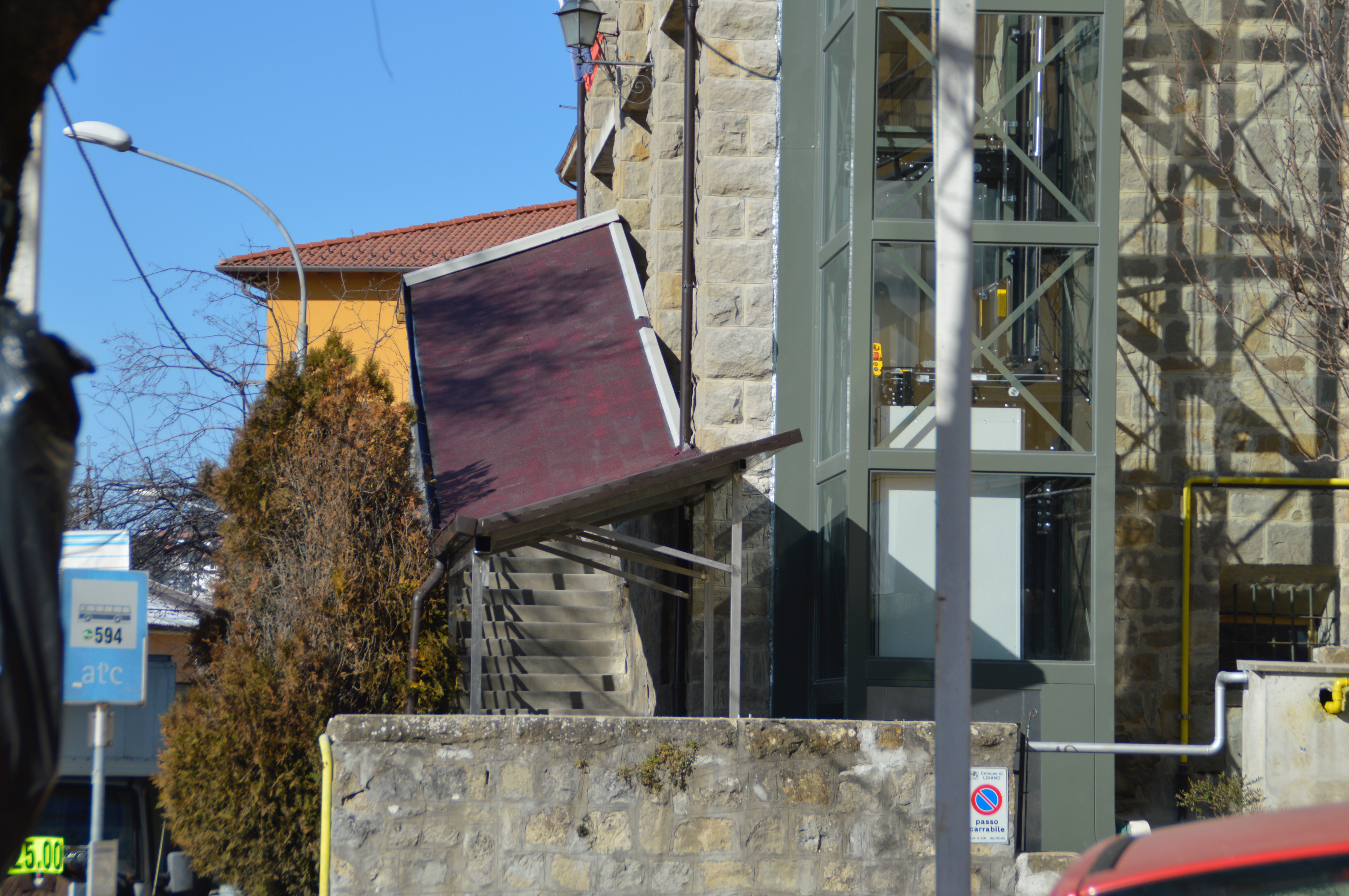Accidentaccio sembra sempre di criticare per partito preso, ma credo proprio che sia la cosa più orribile che mi sia capitato di vedere. Interventi successivi su di una struttura non devono necessariamente coniugarsi con l’edificio, cosa impossibile, ma mostrare proprio la loro “diversità” un “Successivo”, per es. L’ascensore pur non avendo nulla a che fare si amalgama bene, in quanto è chiaro che è “altro” e non fa “finta” di esserlo. Niente di più orribile di voler “imitare” su di una struttura che tra l’altro non è neanche d’epoca. L’aggiunta delle tegole non fa che peggiorare la situazione, facendo sembrare che si voglia mascherare, senza contare il peso, mentre il tutto stride con i montanti nichelati. Notate che c’è un montante (Fianco ascensore) volante, in un punto di grande passaggio, ci metteranno un cartello con divieto di appoggio? E se qualcuno dalle scale ci piomba addosso? Nessuno ha chiesto il mio parere, comunque lo esprimo ugualmente, a posteriori: campata unica in diagonale supportata a fronte da tre montanti conficcati (Come una scala antincendio), copertura in plexiglas (O vetro) poggiata su una graticola a maglie larghe. Il tutto di colore verde da fare pendant con l’ascensore. Se il costo della struttura è X, a naso (E buonsenso), quello dell’ascensore dovrebbe essere almeno tre o quattro volte più alto, data la maggiore complessità dell’opera, quindi o è elevato il costo della struttura o troppo basso quello dell’ascensore, ma queste sono solo illazioni. Comunque non è questo che mi preoccupa. Faccio appello, specialmente alle opposizioni, affinché sia reso pubblico (in rete) il certificato di collaudo. Ricordiamo che un paio di anni fa ci fu una nevicata micidiale che rase al suolo parecchie strutture anche più robuste. Franco Bolognesi