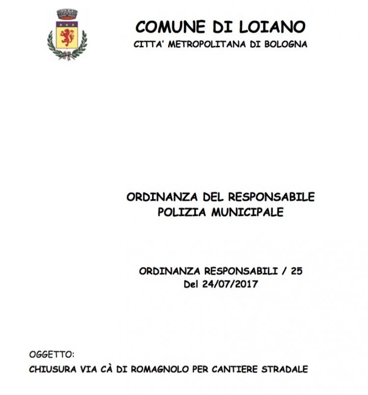 Con l’Ordinanza n. 25 del 24 luglio (allegata), la Polizia Municipale di Loiano ha disposto La chiusura al traffico di Via Cà di Romagnolo nel tratto compreso fra l’incrocio con Via Cà del Goia e Villa Carducci dalle ore 07.00 di venerdì 28 Luglio alle ore 09.00 di sabato 29 luglio 2017