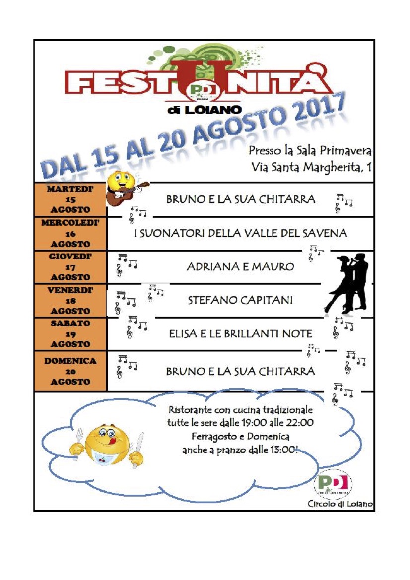 Da martedì 15 a domenica 20 agosto presso la Sala Primavera, si svolgerà la Festa dell'Unità di Loiano.