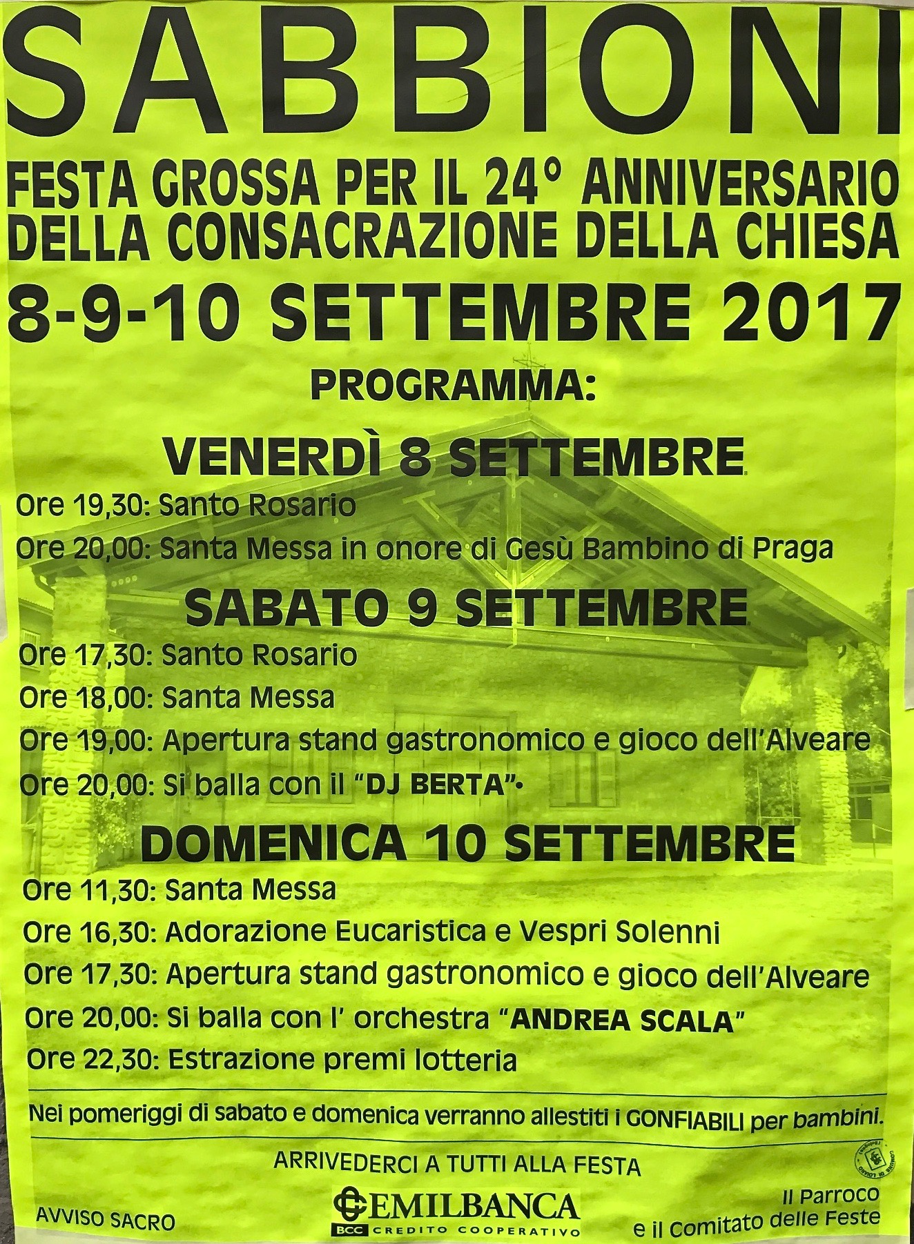 Da venerdì 8 a domenica 10 settembre si terrà la 'Festa Grossa di Sabbioni' nel 24° anniversario della consacrazione della Chiesa.