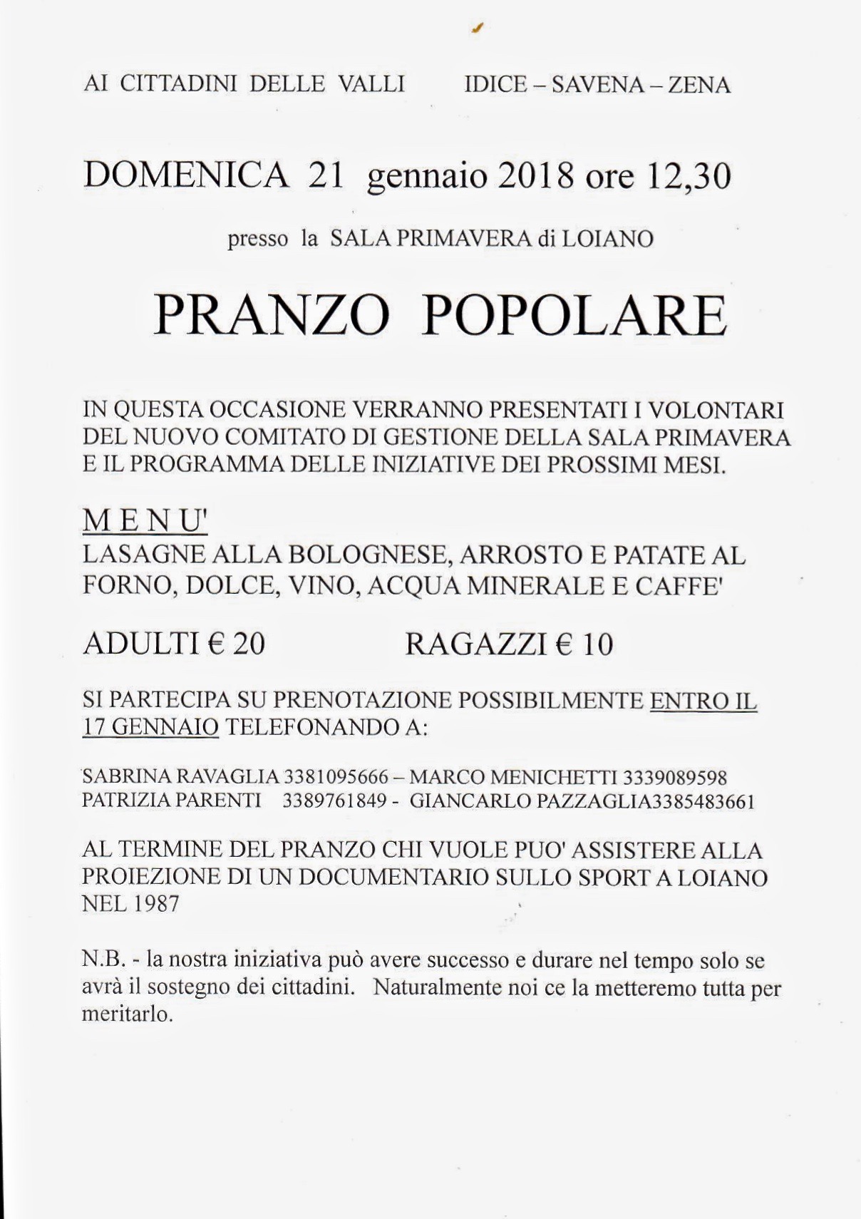 Domenica 21 gennaio alle ore 12.30 presso la Sala Primavera di Loiano, si terrà un 'Pranzo Popolare' e sarà l'occasione per la presentazione dei volontari del nuovo Comitato di gestione della Sala Primavera. Oltre al programma delle iniziative dei prossimi mesi, verrà proiettato anche un documentario sullo sport a Loiano nel 1987.