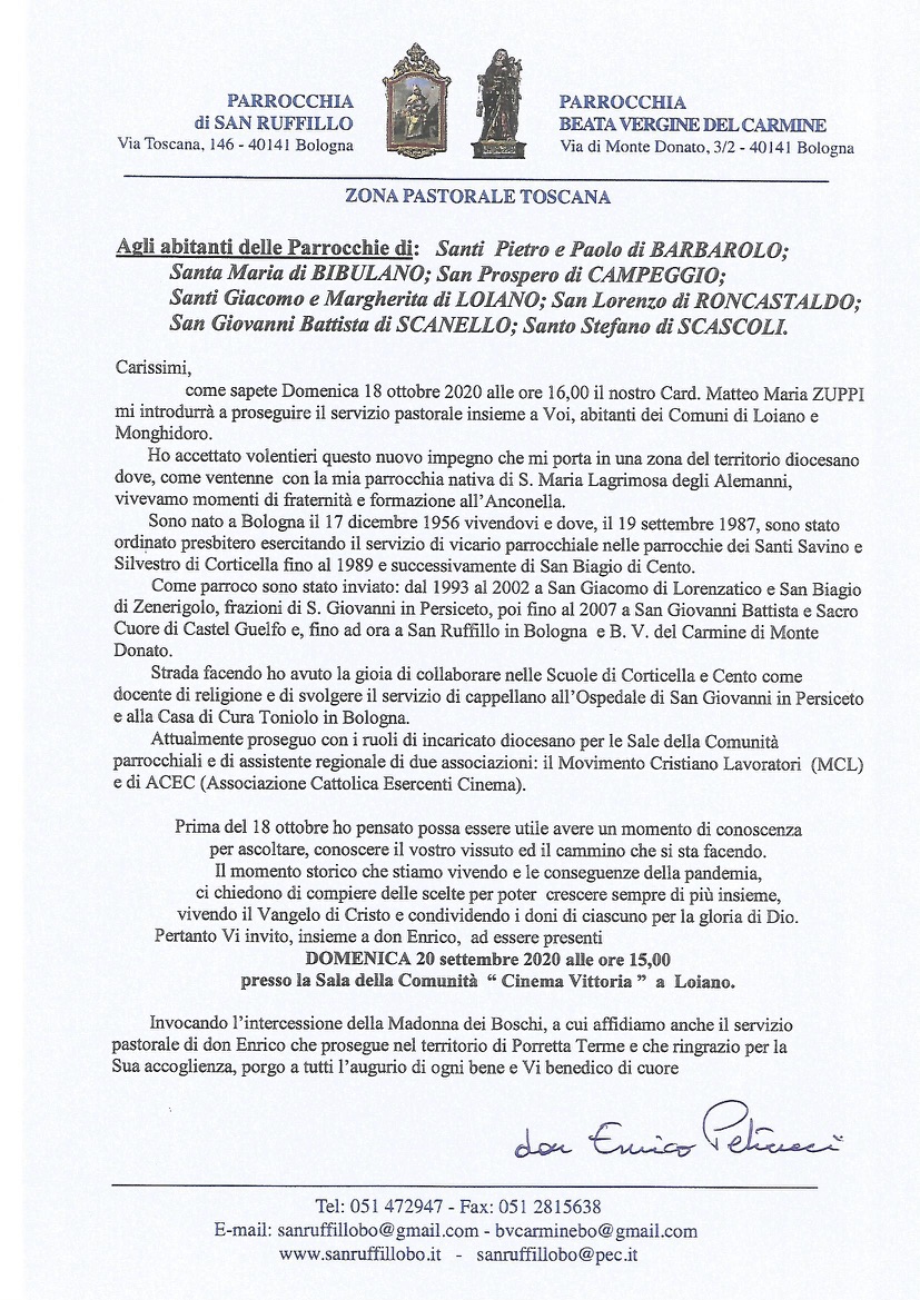 Il futuro parroco di Loiano don Enrico Petrucci, scrive e invita la comunità ad un incontro che si terrà domenica 20 settembre alle ore 15.00 presso il Cinema Vittoria.