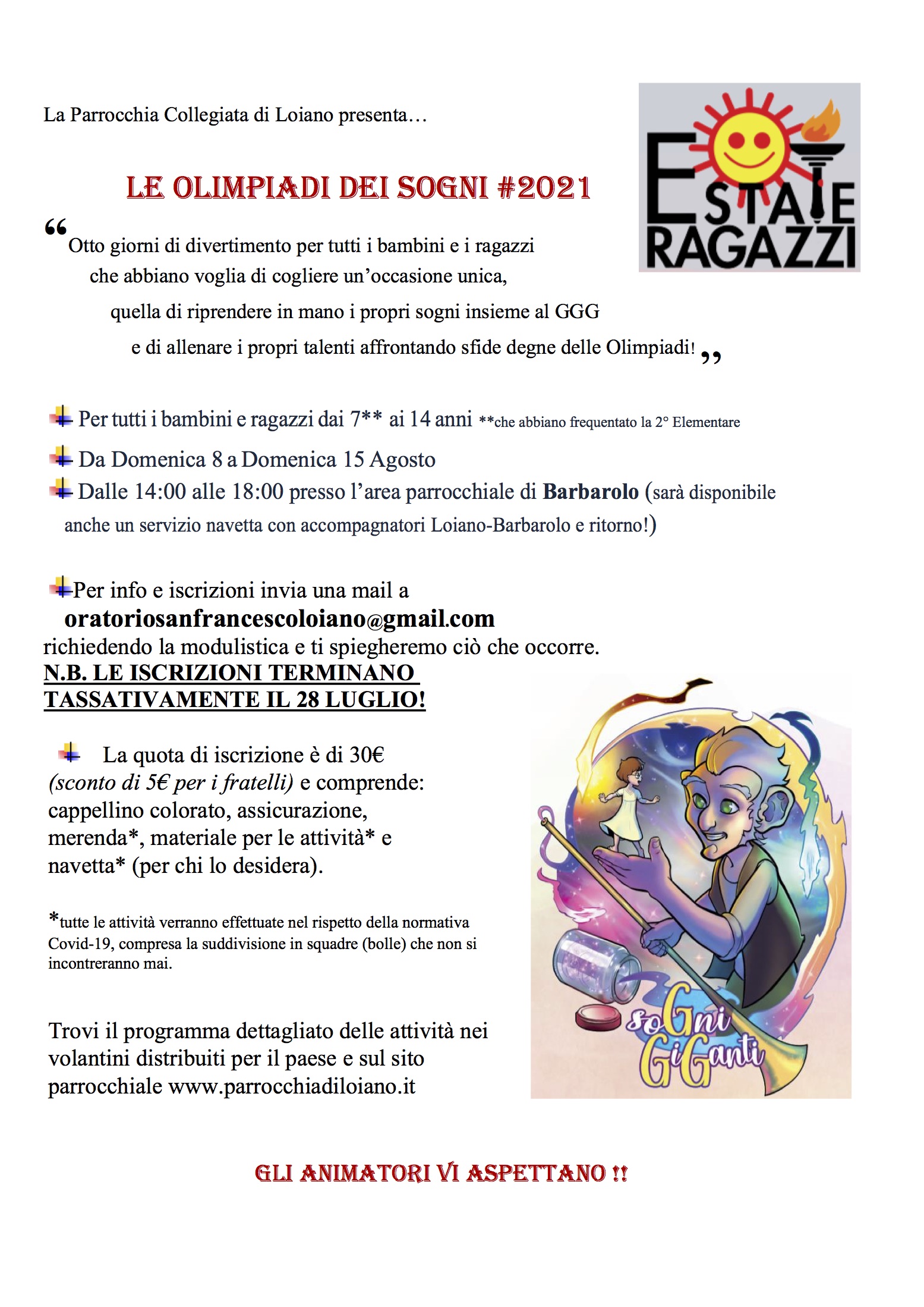 Trovi il programma dettagliato delle attività nei volantini distribuiti per il paese e sul sito parrocchiale www.parrocchiadiloiano.it