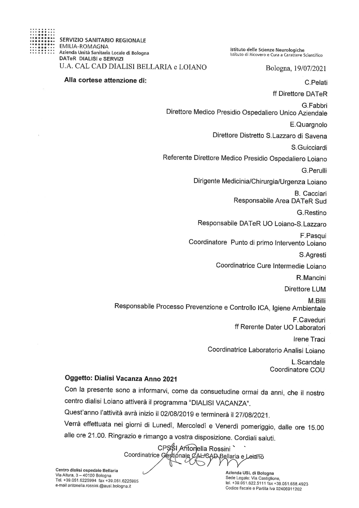 Il Comune di Monterenzio comunica il programma 'Dialisi Vacanze' all'ospedale Simiani
