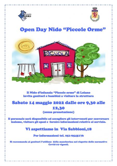 Il Nido d’infanzia “Piccole orme” di Loiano invita genitori e bambini a visitare la struttura sabato 14 maggio dalle ore 9,30 alle 12,30 (senza prenotazione).