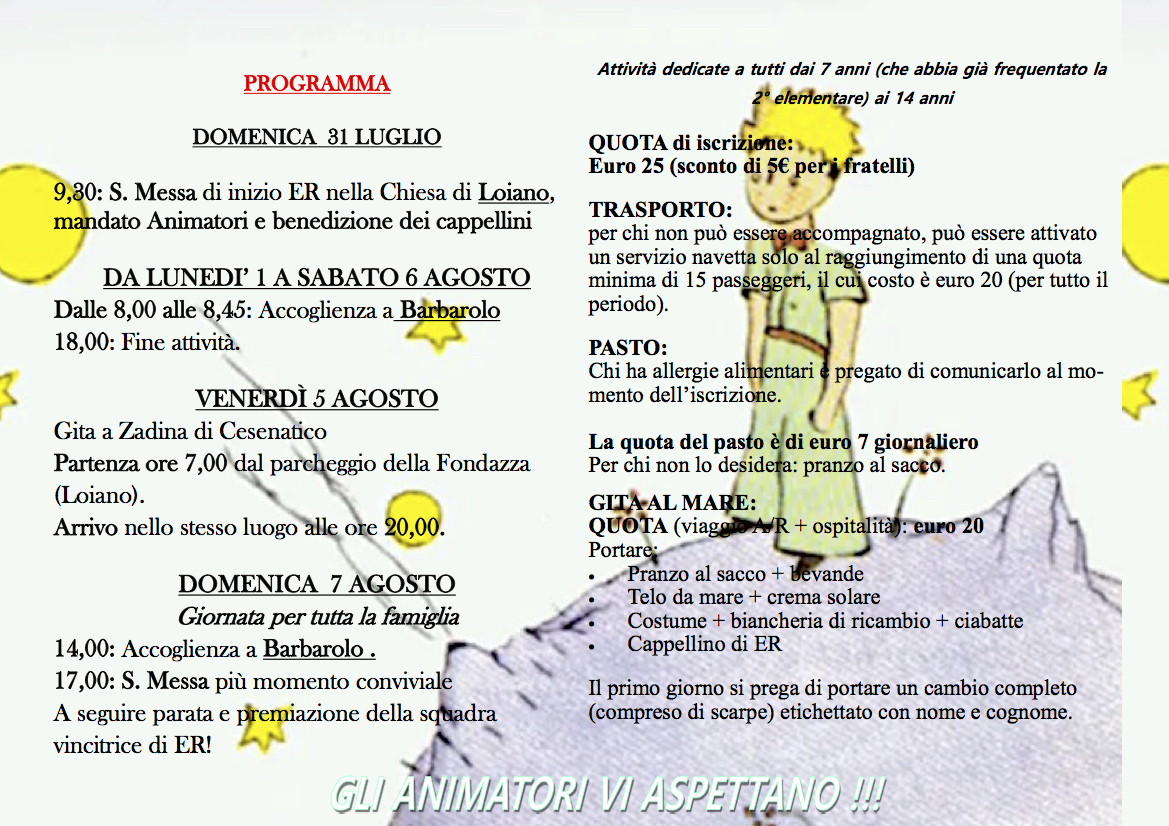 In allegato il programma completo. Per informazioni e iscrizioni: richiedere la modulistica esclusivamente tramite email: estateragazziloiano@gmail.com