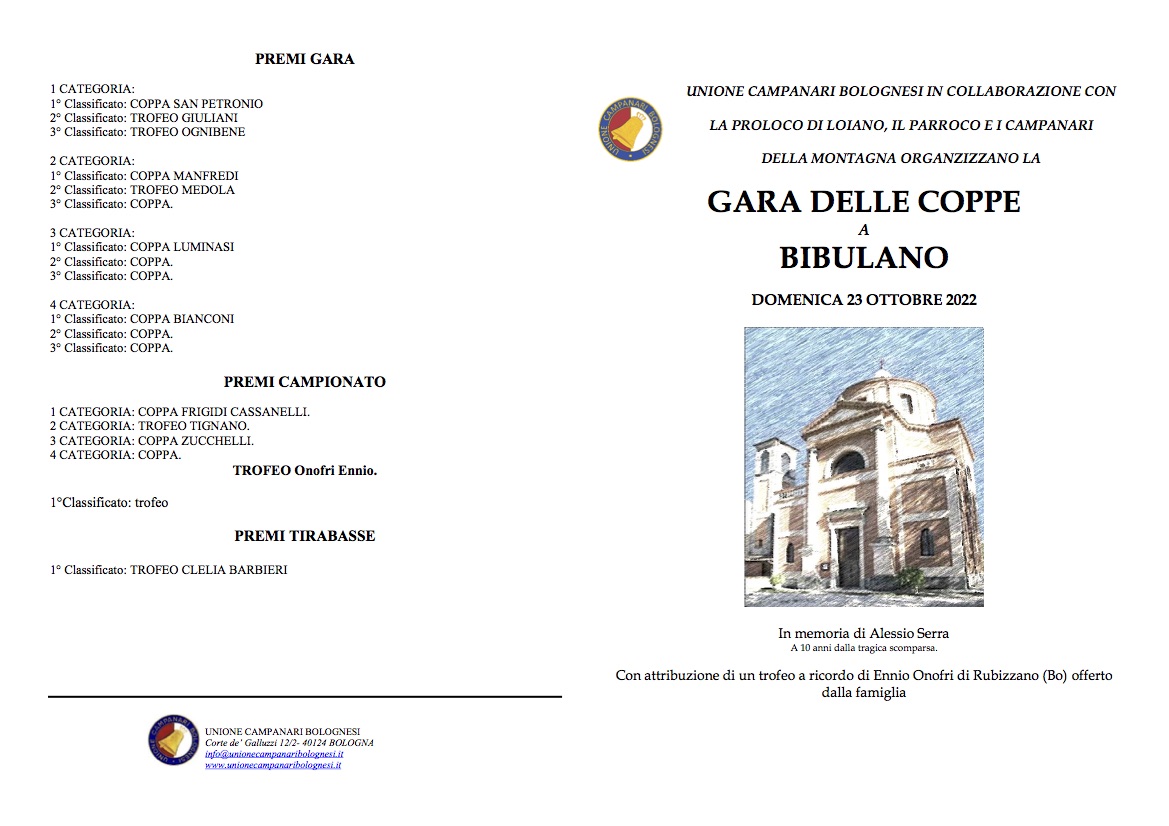 L’Unione Campanari Bolognesi in collaborazione con la Proloco di Loiano, il Parroco, la Parrocchia di Bibulano ed i Campanari della Montagna organizzano per domenica 23 ottobre la Gara delle Coppe a Bibulano.