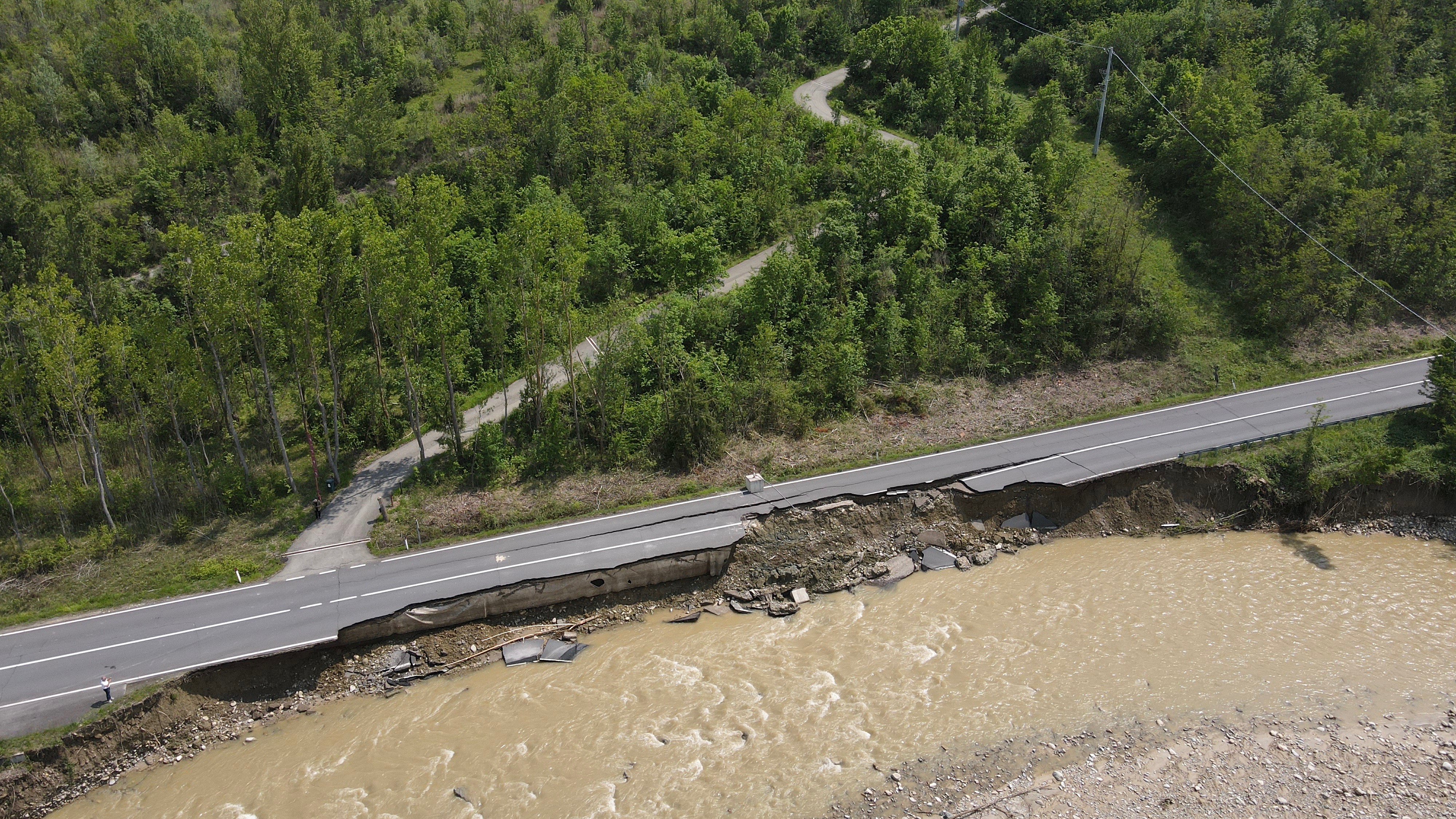 La devastazione che ha colpito la fondovalle strada nei giorni scorsi. Larga parte della carreggiata ormai non esiste più.