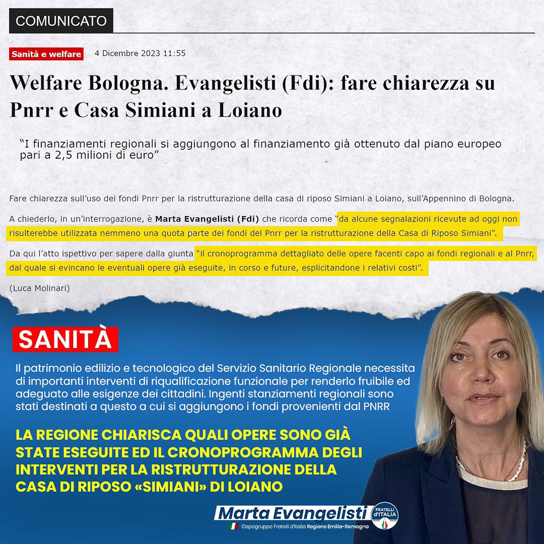 La Consigliera regionale di Fratelli d’Italia Marta Evangelisti, ha depositato un’Interrogazione in merito all’utilizzo dei fondi del Pnrr previsti per la ristrutturazione di Casa Simiani, chiusa ormai da più di un anno.