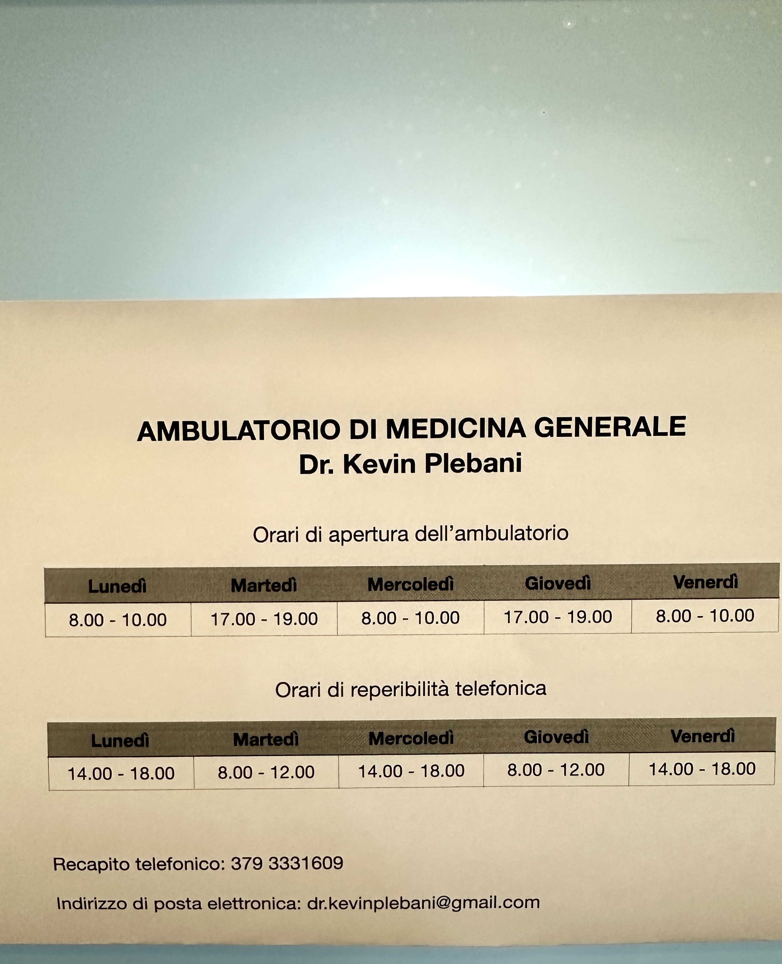 NUOVO MEDICO DI BASE A LOIANO il Dott. Kevin Plebani è il nuovo medico di famiglia del nostro Comune. Riceve presso l’ ambulatorio n 35 (2° piano) dell’Ospedale Simiani il lunedì, mercoledì e venerdì dalle 8.00 alle 10.00; martedì e giovedì dalle 17.00 alle 19.00. Tel. 379.3331609. Al Dott. Plebani i migliori auguri di buon lavoro.