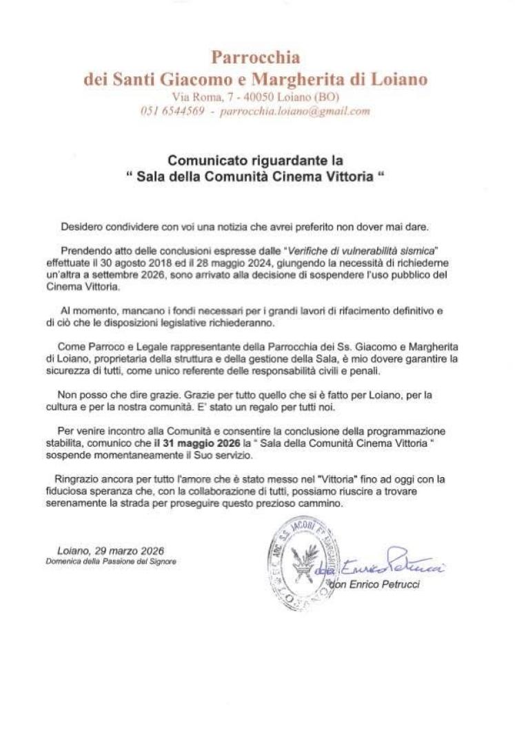 Con riferimento alla chiusura della sala del cinema Vittoria di Loiano, prevista per il 31 maggio 2026, il Circolo Cinema Amici del Vittoria informa che, come negli anni passati, proseguirà a svolgere la propria attività culturale, con particolare attenzione al cinema e alla cultura dell’audiovisivo, anche durante il periodo estivo, nell’ambito delle proprie iniziative.